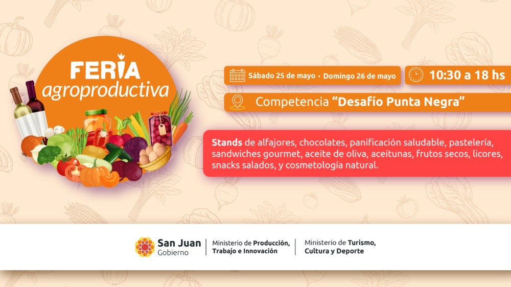 El día sábado 25 y domingo 26 de mayo de 10:30hs a 18hs, productores de la Feria Agroproductiva de San Juan participarán de la competencia Desafío Punta Negra exponiendo sus productos para que todas las personas que concurran puedan disfrutar de los sabores de San Juan.